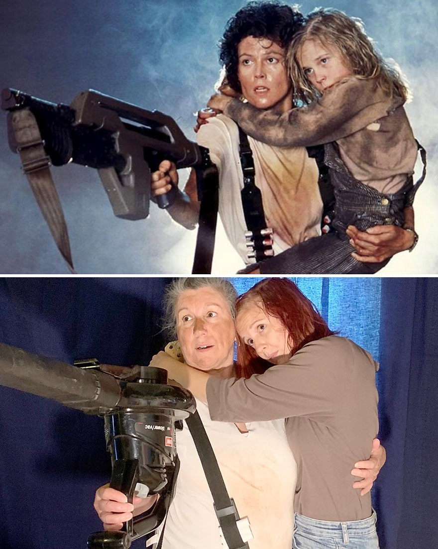 На пике пандемии люди изнывали от скуки в самоизоляции и искали способы себя развлечь — так в соцсетях родилось множество челленджей, например, воссоздать шедевры из музеев, используя подручные средства. Будучи заядлыми киноманами, Айлия Колвелл с мужем немного изменили правила, повторив культовые сцены из фильмов и сериалов — благо, реквизита у них оказалось полно.
