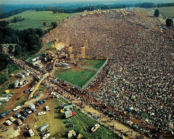 33. Вид с воздуха на более 400 000 посетителей фестиваля Вудсток, 1969 год