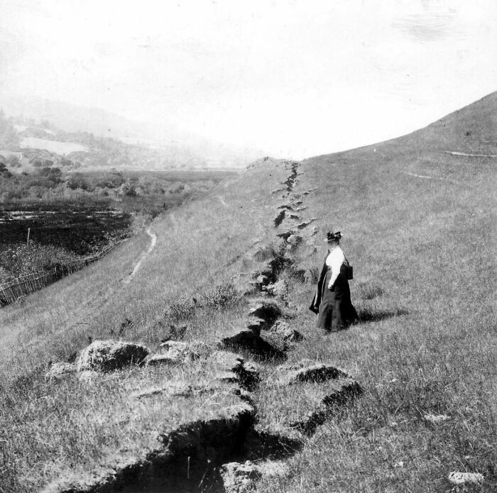 28. Известный ботаник Элис Иствуд осматривает трещину, оставшуюся после землетрясения 1906 года около Олемы, Калифорния