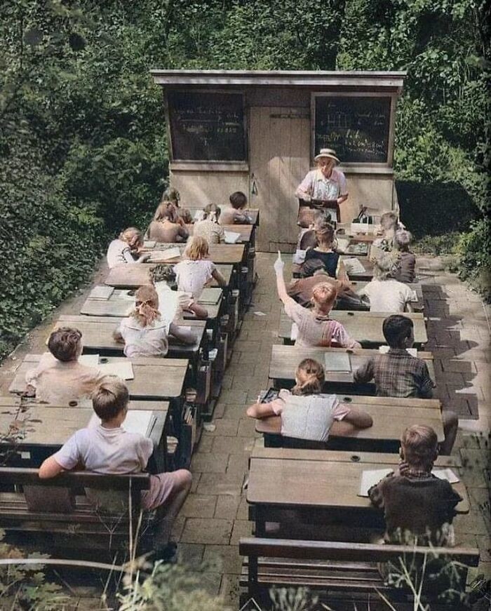 2. Уроки на свежем воздухе в 1957 году, Нидерланды. В начале 20 века в Европе школы под открытым небом стали набирать популярность