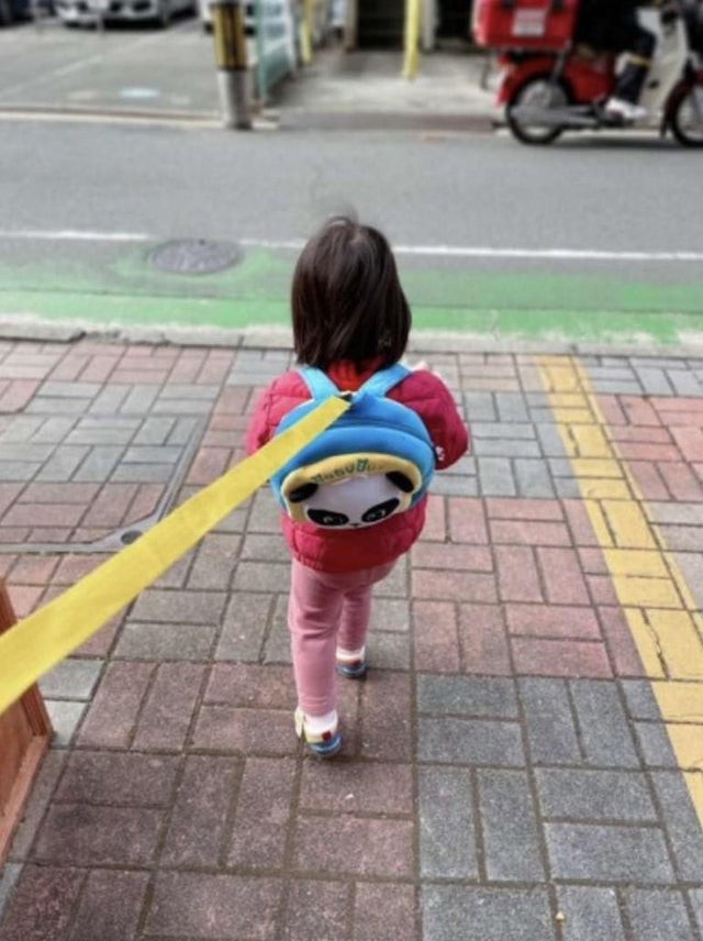 Совершенно типичная прогулка с ребенком для японцев, чтобы обезопасить чадо от выбегания на дорогу