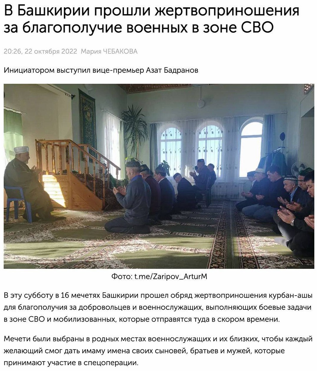 - В Башкирии принесли в жертву овец для благополучия орков, которые пошли воевать в Украину. Обряд прошёл в 16 мечетях.