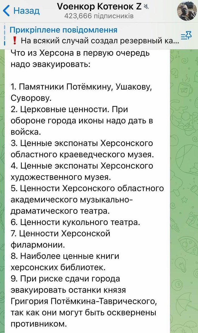 Пропагандисты советуют ванькам ограбить херсонские музеи, церкви и библиотеки и вывезти оттуда самые ценные экспонаты.