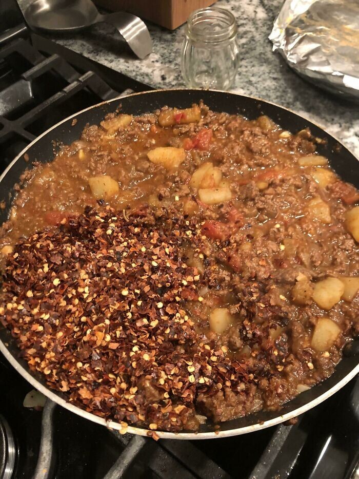 "Мой парень решил слегка посыпать жаркое хлопьями жгучего перца, когда с банки неожиданно упала крышка"