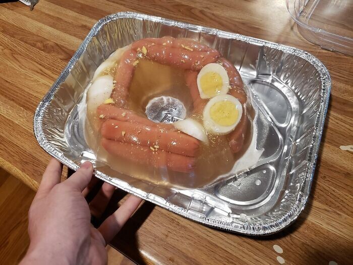 "Сделала для гостей залоивное из сосисок с яйцами, но, посмотрев на него, стала сомневаться, что гости его оценят"