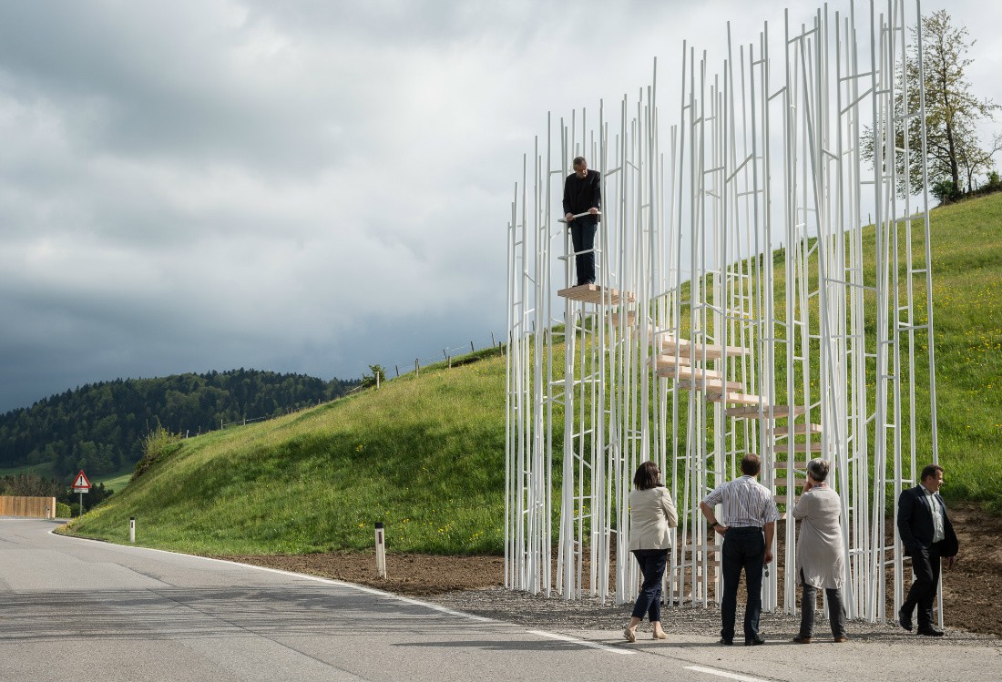 Рекордсменом по числу пусть и не всегда практичных, но уж точно интригующих остановок является Австрия. Например, там можно обнаружить вот такой объект, состоящий из металлических труб и винтовой лестницы в никуда. От непогоды она, конечно, не защитит, но внимание привлечёт точно.