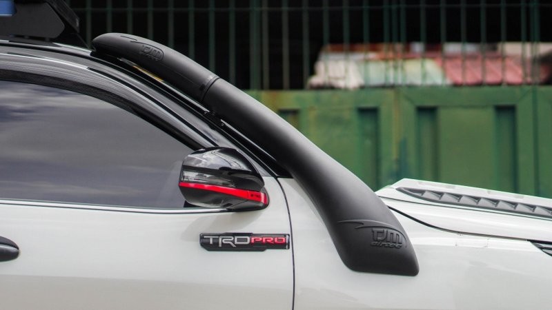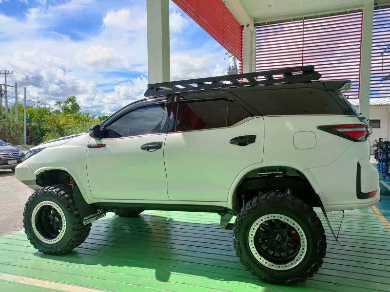 Заметные изменения в Toyota Fortuner включают внедорожные бамперы, колёса и шины, лифт подвески, шноркель, багажник на крыше и многое другое.