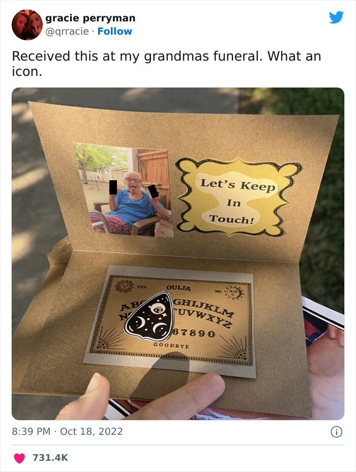 Этот снимок разместила в Твиттере Грейси, внучка Джоди, и он очень понравился людям. Во-первых, обратите внимание на фотографию бабули. Она явно была той еще озорницей. Во-вторых, идея раздать гостям на похоронах доски для спиритических сеансов просто гениальна.