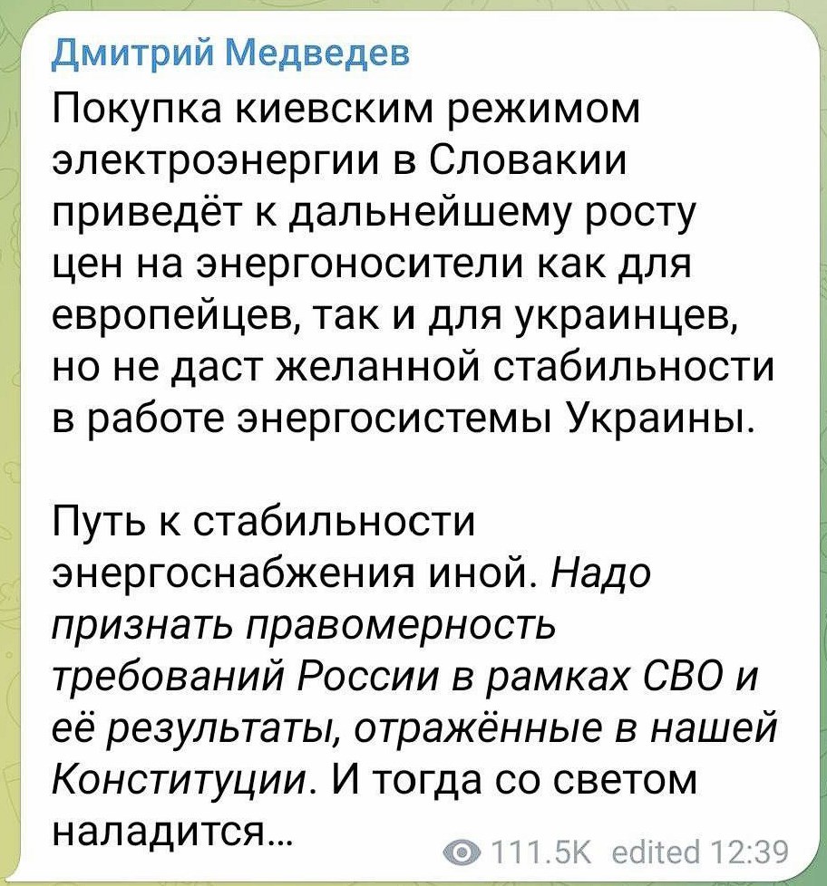 - Медведев переживает, что свет в Украине подорожает, поэтому украинцам надо сдаться