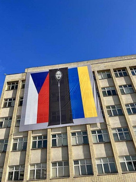 - На здании МВД Чехии между чешским и украинским флагом вывесили изображение путина в мешке для трупов.