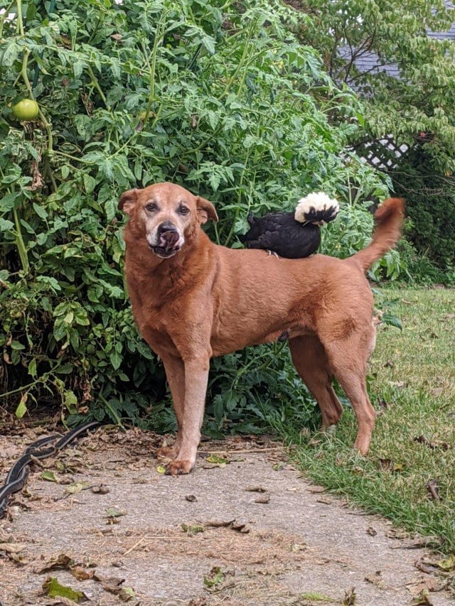 Моя собака возит цыплёнка на себе по двору, когда он не может найти других цыплят.