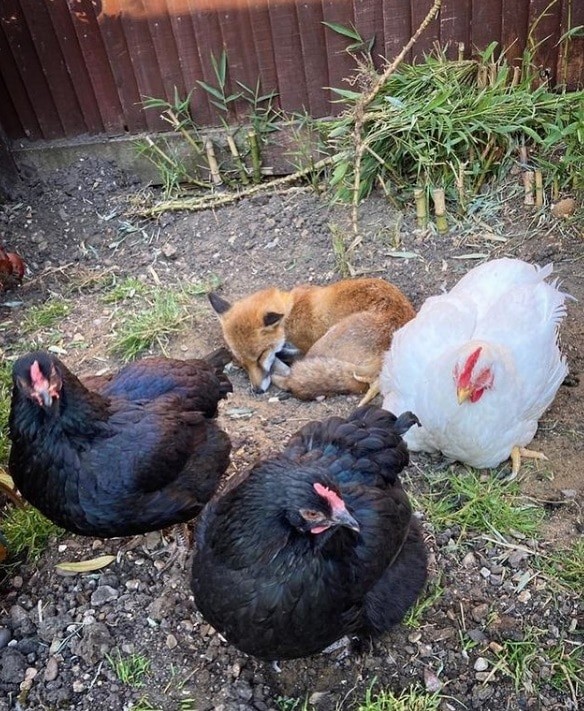 Лиса Тыковка часто приходит в сад, где проводит весь день со своими друзьями-цыплятами, которые охраняют её каждый раз, когда ей вздумается вздремнуть.