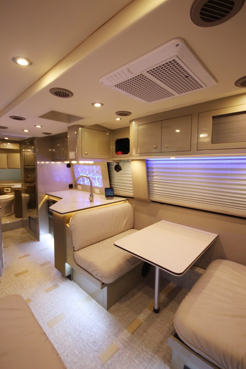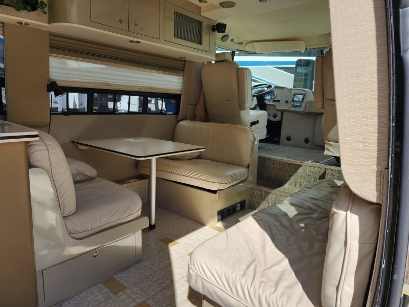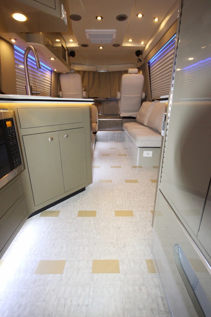Салон кемпера не только получил современную отделку, но и обзавелся целым рядом соответствующего оборудования (к примеру, его снабдили термостатом и обогреваемыми полами).