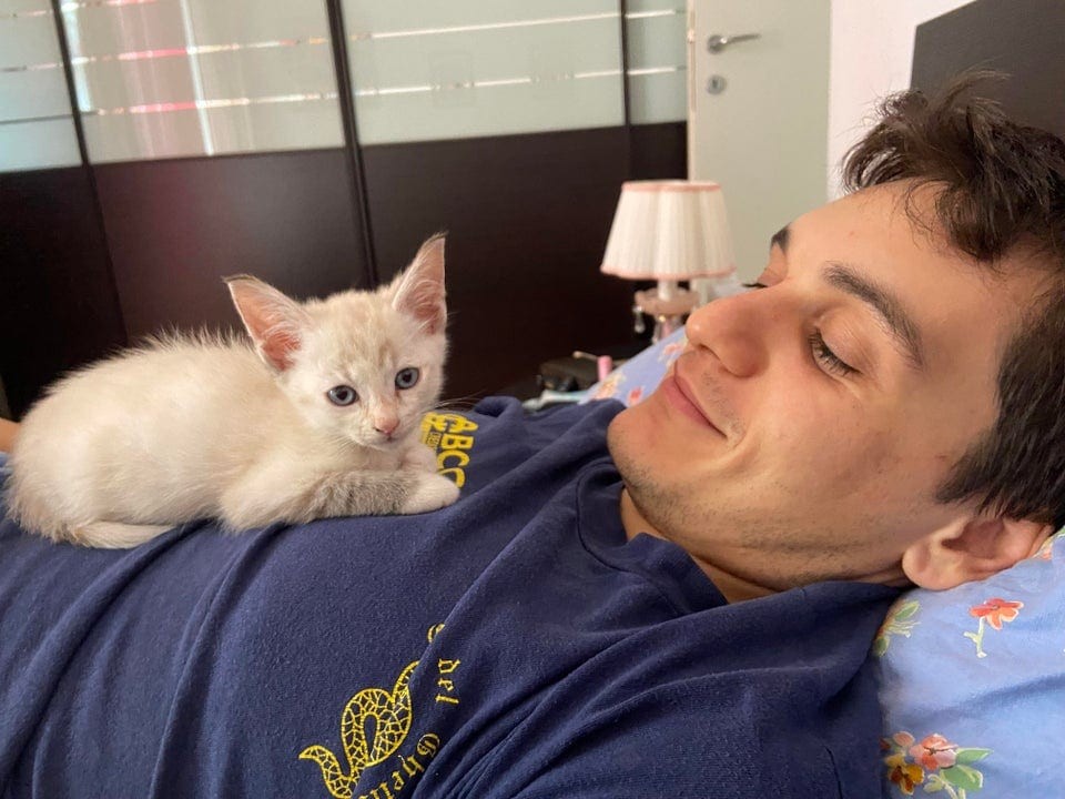 Взял беременную бездомную в конце прошлого года. Когда котята подросли, я нашёл для них хороших хозяев среди своих друзей. Отец одного друга сказал категорически: «Нет, даже не думай об этом». Котёнка привезли на Рождество, и теперь они неразлучны.