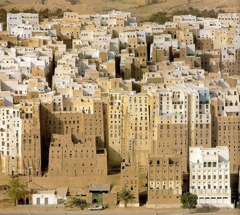 Шибам Хадрамаут, город в Йемене с 5-11-этажными небоскребами из глиняного кирпича, некоторые из которых построены в 1500 году. В основном это жилые дома