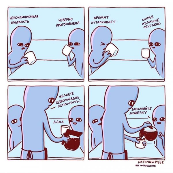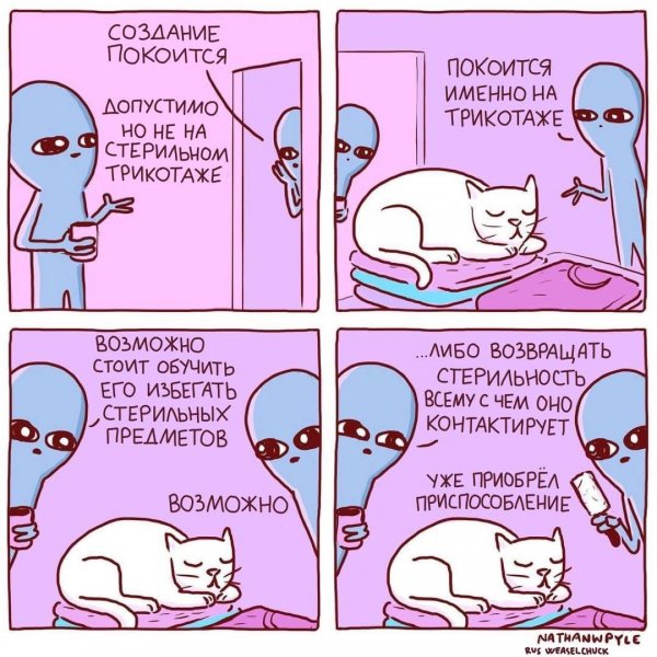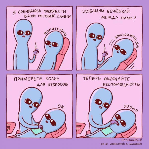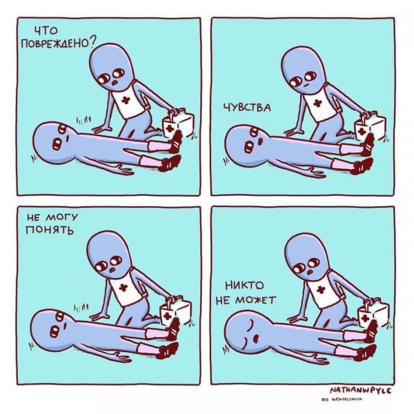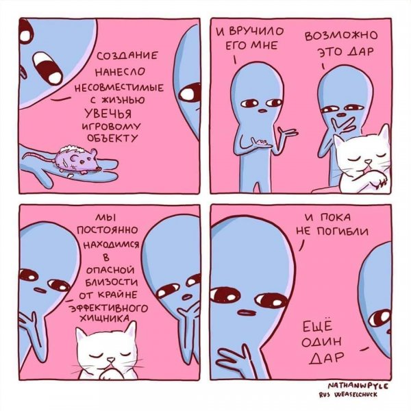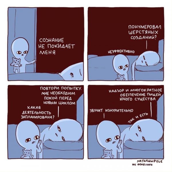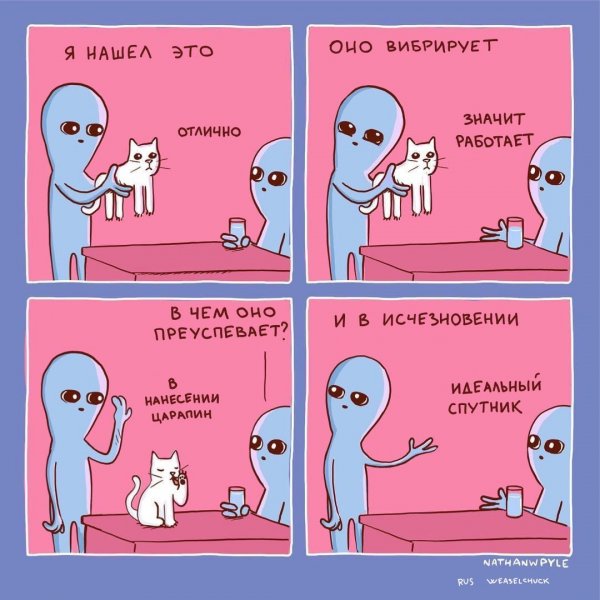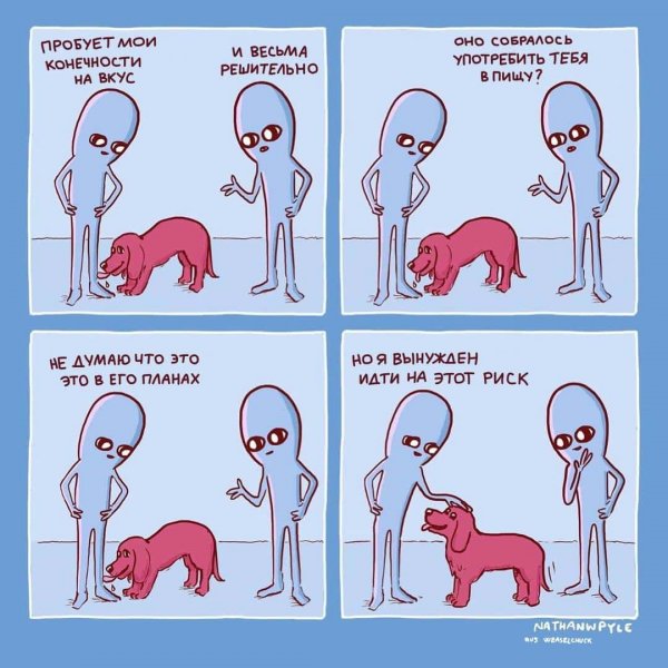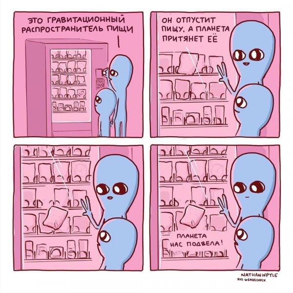 Художник Нэйтан Пайл нарисовал забавный комикс про инопланетян, которые пытаются жить по традициям и устоям землян. При этом все человеческие переживания они обсуждают техническим языком. Серия комиксов получила название "Странная планета". Комикс не только отлично поднимает настроение, но и позволяет посмотреть на нашу жизнь глазами пришельцев.