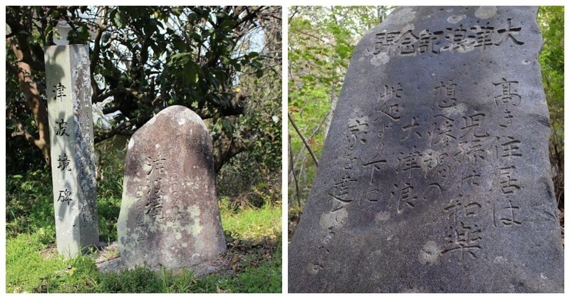 Такие плиты обычно появлялись после очередного смертоносного цунами, такого как, например, в 1896 году, когда погибло 22 000 человек. Есть также камни, указывающие на то, что в этом месте достаточно высоко и безопасно в случае прихода фатальной волны.