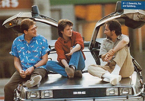 Роберт Земекис и Майкл Дж. Фокс на съемочной площадке фильма "Назад в будущее"