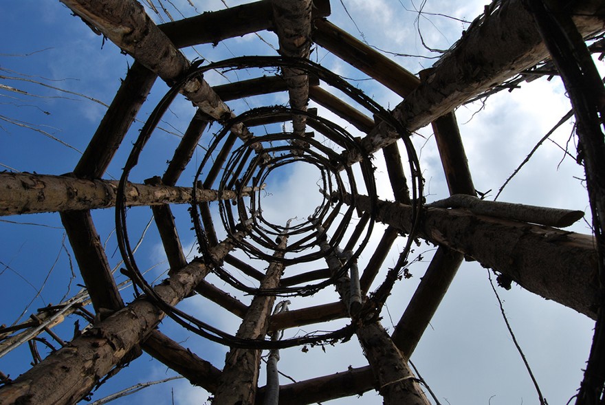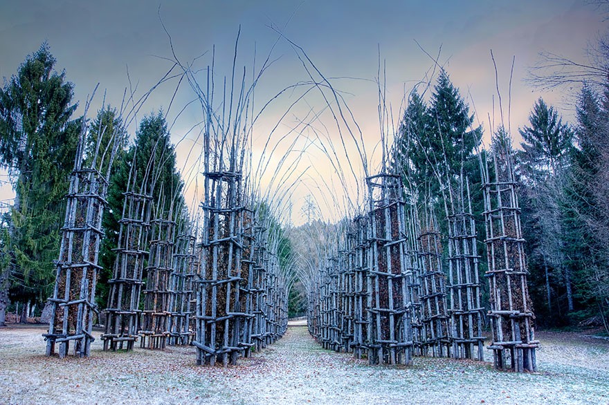 В этом проекте использовалось 1800 еловых стволов, а также 600 веток каштана, которые затем скрепили с помощью 6000 метров веток фундука. Художник сделал это, используя традиционные методы плетения.