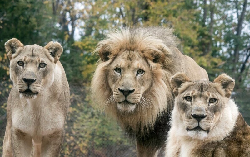 Бриджит (справа) с львицей Тией (слева) и львом Хьюбертом (в центре), зоопарк Оклахома-Сити