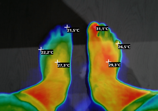 Тепловая камера показывает разницу температур обычной стопой и стопой с вросшим ногтем