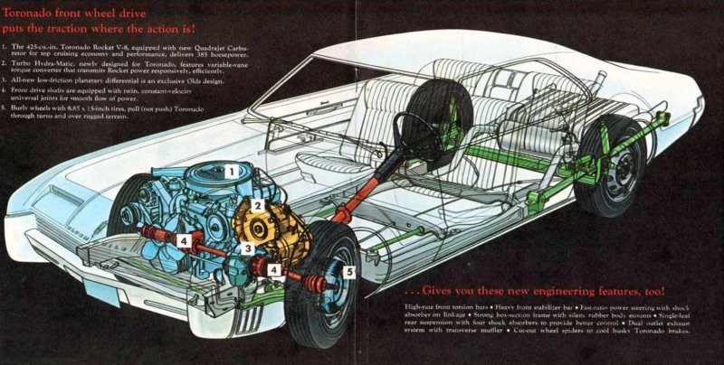 Сегодня таким некого не удивишь, но в 60-х годах передний привод, в Америке встречался крайне редко, особенно на больших и дорогих купе премиум-класса, таких, как Toronado. Инженеры полагали, что привод на переднюю ось приносит лучшую устойчивость во время движения и освобождает больше места в салоне, и пройдет много лет, прежде чем конкуренты последуют такому шагу.