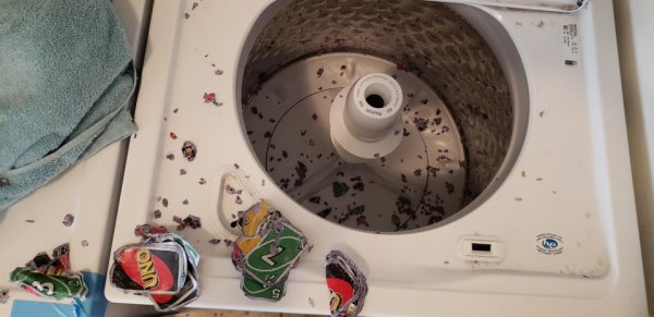 Результат стирки колоды Uno. Никто не заметил, как она попала в бельё для стирки.