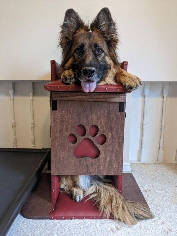 Это не совсем обычный стул. Он нужен собакам, имеющим мегаэзофагус — расширение пищевода. После кормления приспособление позволяет оставаться собаке в вертикальном положении, благодаря чему пища и вода следуют от глотки к желудку и правильно усваиваются.