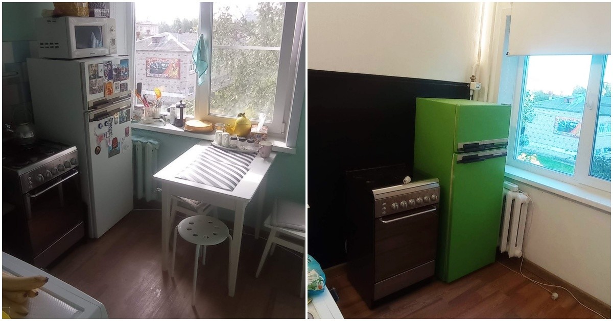 Часть мебели оставили, но перекрасили. Даже холодильник стал зеленый.