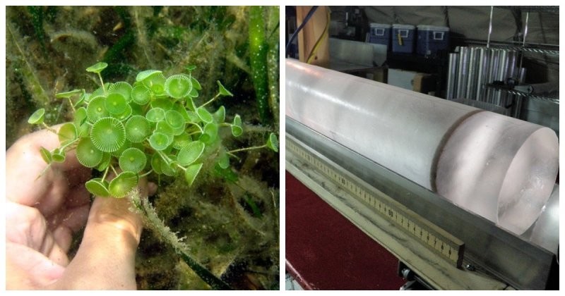 Ледяное ядро Антарктиды, которое показывает годы, подобные "кольцам дерева", с темным слоем вулканического пепла, который осел на ледяном покрове примерно 21 000 лет назад