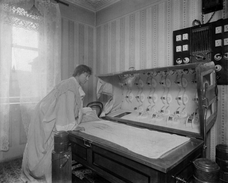 Это слегка напоминает гроб, но это "электрическая ванна", предшествовавшая знакомому нам солярию. Именно так получали загар женщины в 1900 году.