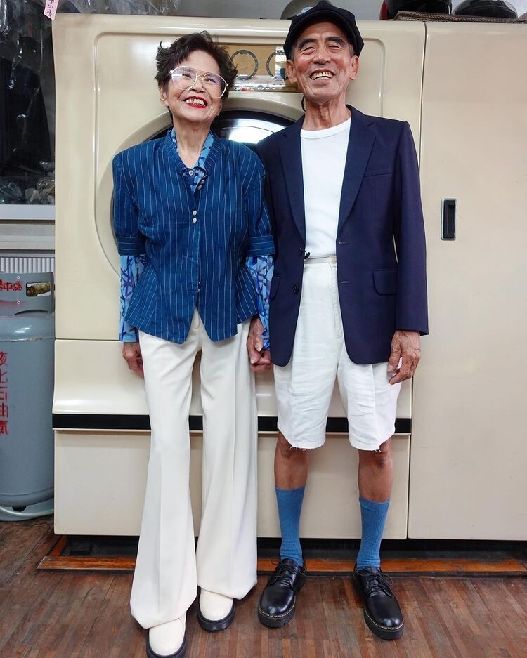 Пожилая пара не только умело сочетает забытую одежду с подходящей по стилю, но и с завидной легкостью моделирует свои готовые наряды. Их ироничный и эклектичный стиль доказывает, что одежда может быть одновременно и вдохновляющей, и веселой.