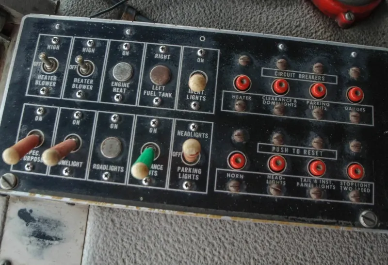 Имеется даже некая «Система защиты тягача», выведенная на отдельный рычажок, вот только я не понял принцип её действия. Ниже флажок выбора состояния дороги. К переключателям подходят трубки, а не провода, так что исполнительные механизмы систем пневматические.