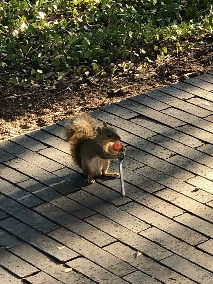Белка стащила вилку с клубничкой