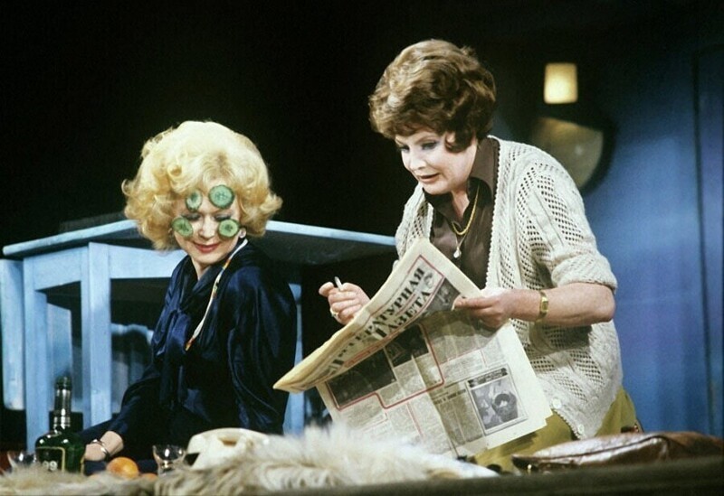 Светлана Немоляева и Татьяна Доронина в сцене из спектакля "Она в отсутствии любви и смерти" по пьесе Э.Радзинского. Московский академический театр имени В.Маяковского, 1981 год