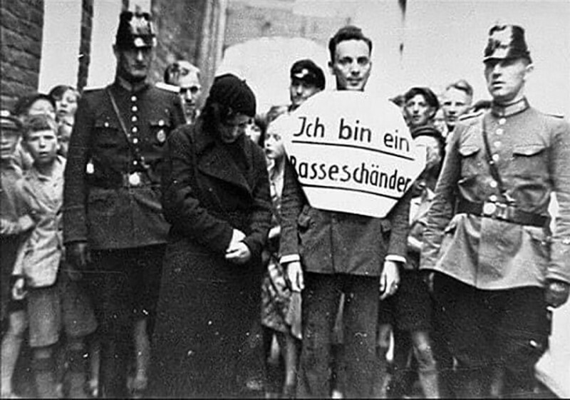 Немецкий мужчина обвиненный в связи с еврейской женщиной. Надпись - "Я - осквернитель расы". Германия, 1935 год