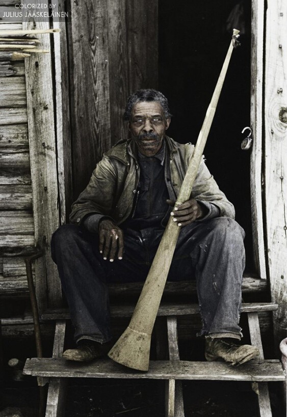Бывший раб, держит рог, которым созывали рабов. Недалеко от Маршалла, Техас, США, 1939 год