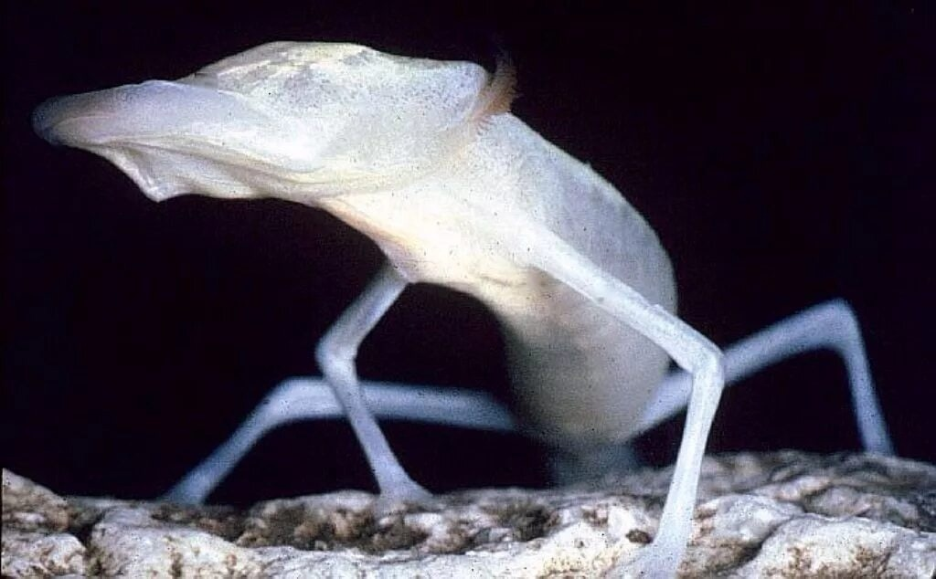 Никто точно не знает, когда начались метаморфозы этих существ и сколько потребовалось времени, чтобы так их изменить. Тоненькие ножки-палочки поддерживают длинное, почти прозрачное тело с кроваво-красными жабрами. Лопатообразная морда, на которой не то что эмоций нет, но сами глаза заросли кожей — в месте, где нет света, высматривать кого-то без надобности.