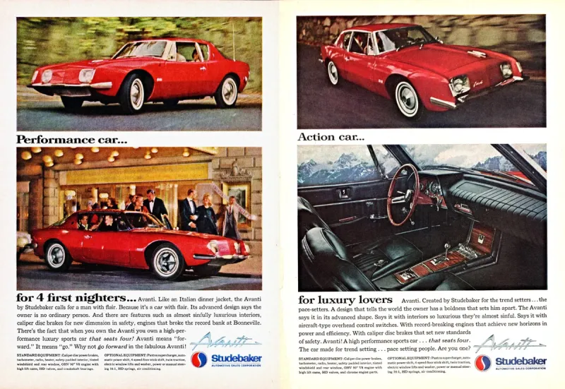 Разработанный всего за 40 дней командой под руководством Реймонда Лоуи, Studebaker Avanti был роскошным, быстрым, технически продвинутым и красивым. К сожалению, производство кузова из стекловолокна оказалось проблематичным, и выпуск оказался ограничен.