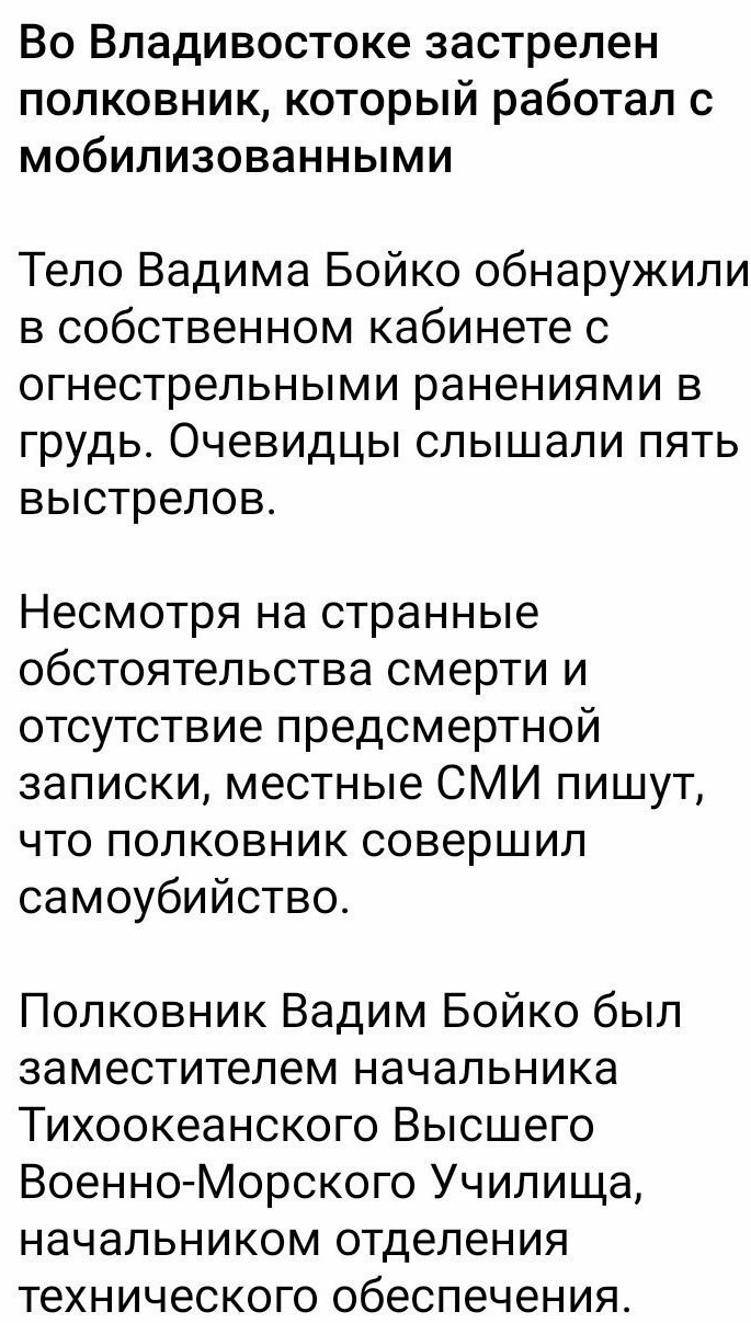 - Минутка загадочных смертей на болотах: во Владивостоке застрелен полковник, который работал с мобилизованными. Тело Вадима Бойко обнаружили в собственном кабинете с огнестрельными ранениями в грудь. Очевидцы слышали пять выстрелов.