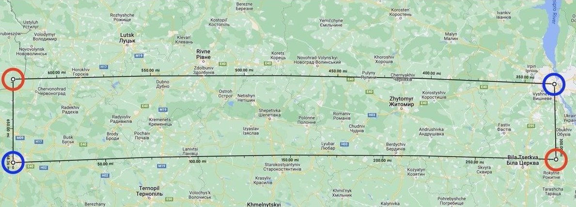 Координаты Киева: 50.4501° N, 30.5234°E; Координаты Львова: 49.8429° N, 24.0311° E; Координаты точки прилёта двух ракет в Польше, в результате чего погибли два человека: 50.4501° N, 24.0311° E