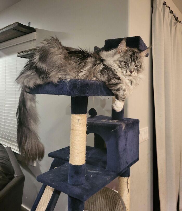"Наш мейн-кун отказывается признавать, что он уже вырос из этого кошачьего домика"
