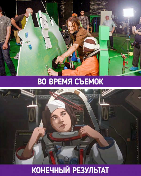 Сцена из мультфильма «Аполлон-10½» до и после наложения спецэффектов