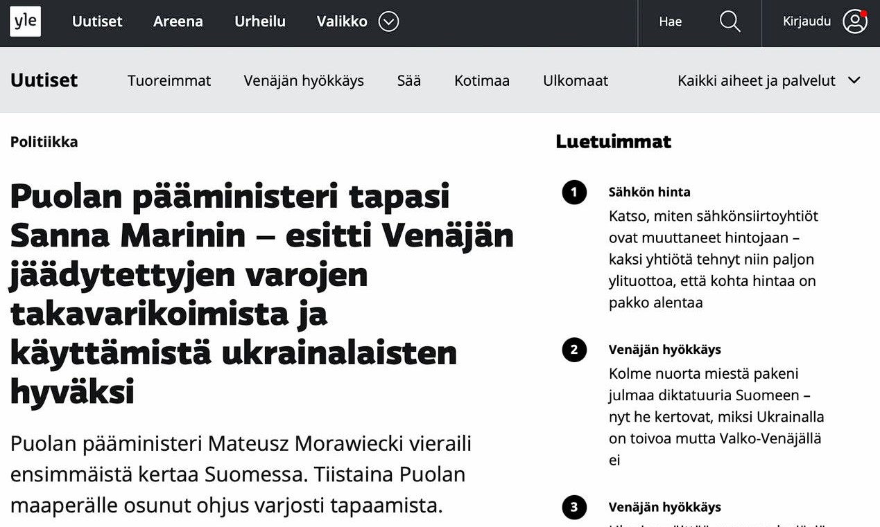 - Все арестованные активы рф — Украине. Премьер-министр Польши во время визита в Финляндию предложил конфисковать активы России в ЕС в пользу Украины. Финский премьер Санна Марин его полностью в этом поддержала.