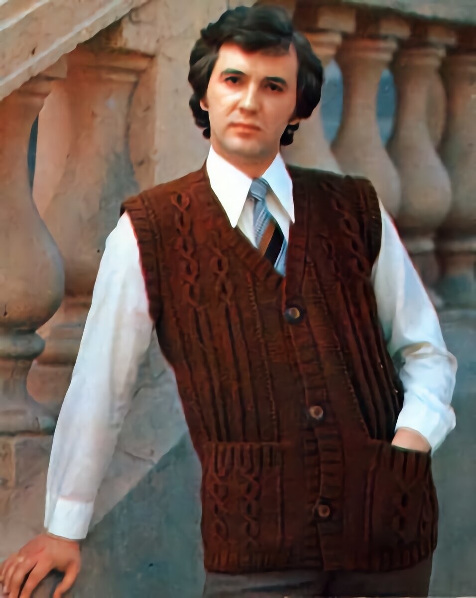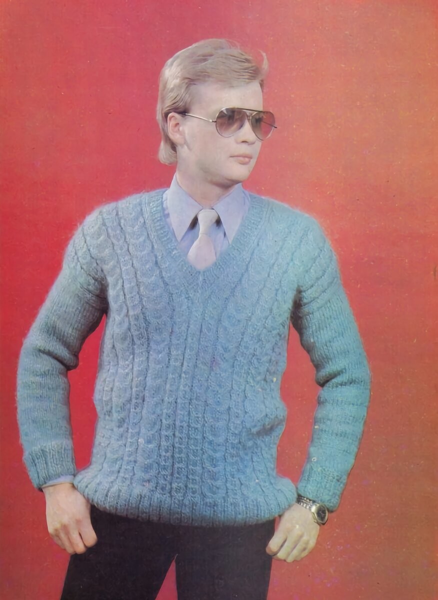 Очень хорошо узнаю этот пуловер. Такой вязала для меня мама и я носил его в институт. Вот точно так же - с рубашкой (только без галстука). Но, конечно, не голубой. Голубой бы я не надел. У меня был светло-серый.