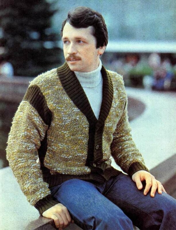 Это фото из того же журнала за 81-й год, что и предыдущее. Ну совсем же другое дело. Вполне приземленная, практичная вещь. Правда, меланжевая пряжа и контрастная отделка - это больше женская тема, как по мне. Мне кажется, мужской вариант должен быть более строгим, однотонным.
