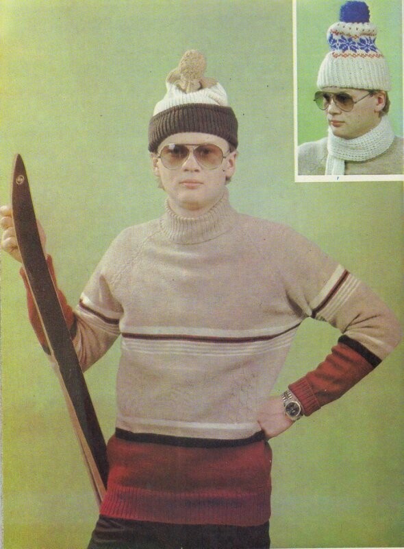 Вот, например, вполне неплохой свитер. У меня был подобный в студенческие времена. Правда, не вязанный, а купленный мамой в универмаге. Но эта лыжная шапочка - полный провал.