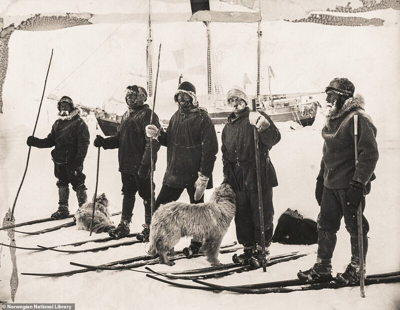 На этом снимке, сделанном в первую зиму экспедиции, члены экипажа Антон Амундсен, Педер Хендриксен, Ивар Могстад, Хенрик Греве Блессинг и Отто Свердруп возвращаются из лыжного похода. «Катание на лыжах было самой важной формой упражнений, и большинство участников по возможности катались на лыжах в одиночку или в группе», — говорит Клевер. Экспедиционные ездовые собаки были куплены в России: они были приобретены Нансеном, когда корабль пристал к ненецкому становищу Хабарово в июле 1893 года. В книге говорится, что Нансен был разочарован, увидев собак, так как «все, кроме четырех, были кастрированы». В книге поясняется: «Это было сделано потому, что обычно шлейка проходила между ног собак и часто вызывала травмы». Таким образом, план Нансена по увеличению популяции собак был серьезно затруднен».