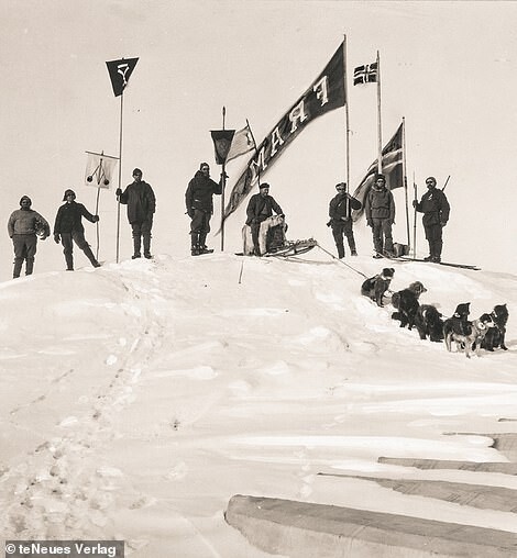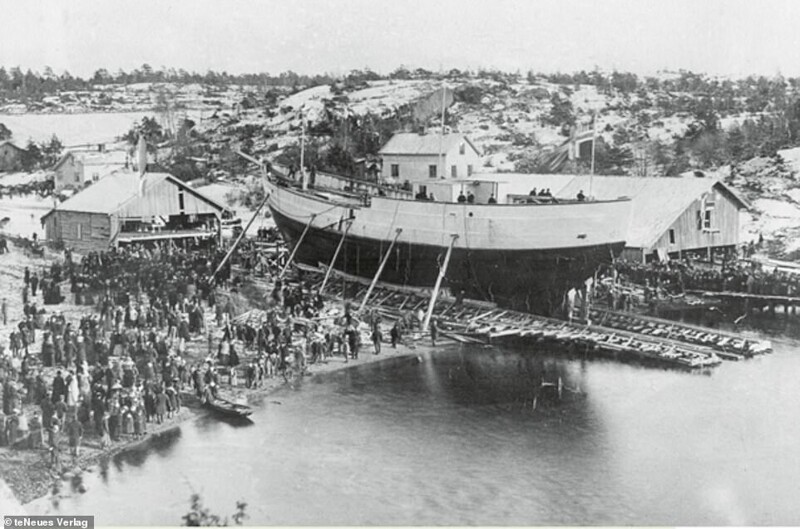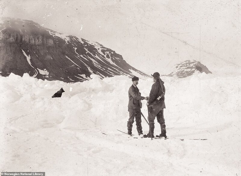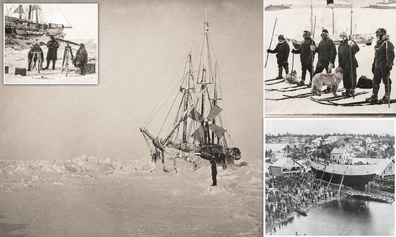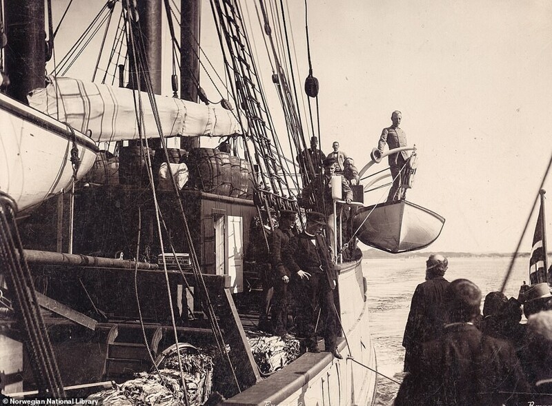 Провожаемая ликующей толпой, экспедиция на «Фраме» отправилась из Кристиании (современный Осло) 24 июня 1893 года, сделав четыре остановки в Норвегии - в Бергене, Тронхейме, Тромсё и Вардо, прежде чем прибыть в становище Хабарово в России. Его следующей остановкой был мыс Челюскин в России, после чего они еще некоторое время продолжали движение на восток. Затем экспедиция направилась на север и позволила кораблю застрять в дрейфующих льдах. На этом снимке показан момент, когда Нансен (на фото со шляпой в руке в центре справа) и команда, стоящие на борту «Фрама», прощались со зрителями в Бергене 2 июля 1893 года. Два дня, предшествовавшие этому моменту, были наполнены светскими событиями для команды исследователей - «вечеринки, музыка, концерты и танцы». «Некоторые члены экипажа особенно оценили лившееся рекой шампанское», - пишет Клевер.
