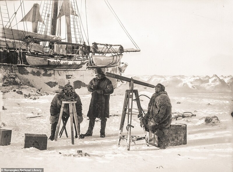 Эта фотография сделана 6 апреля 1894 года. На ней Нансен, Скотт Хансен и Ялмар Йохансен наблюдают солнечное затмение с дрейфующих паковых льдов. Йохансен записал в своем дневнике в тот день: «Должно было произойти солнечное затмение, которое можно было увидеть с нашей долготы». Хансен работал до поздней ночи, чтобы рассчитать время затмения и его продолжительность. По его расчетам, оно должно было начаться в полдень, но для верности мы начали вести наблюдения заранее. Ради этого мы использовали самый большой астрономический бинокль и универсальный инструмент инструмент для измерения высоты небесного тела и его направления от наблюдателя».